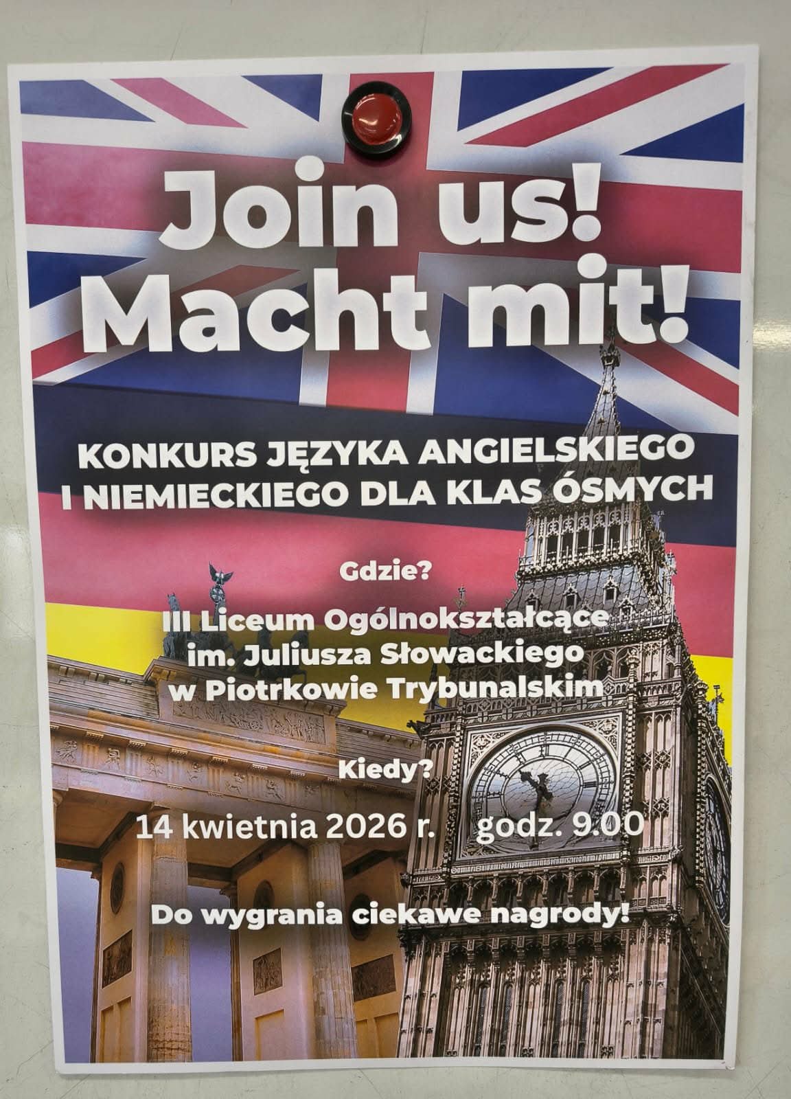 im. Juliusza Słowackiego w Piotrkowie Trybunalskim. Uczestnicy pisali test sprawdzający znajomość struktur leksykalno-gramatycznych, rozwiązywali zadania otwarte oraz zamknięte. Na rozwiązanie testu mieli 60 minut. W dniu 17.04 podczas Dni Otwartych zostały wręczone nagrody.