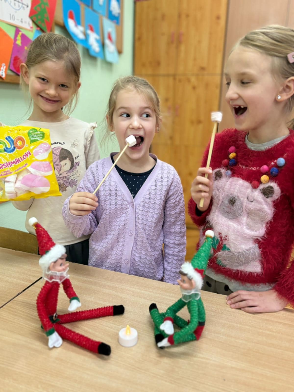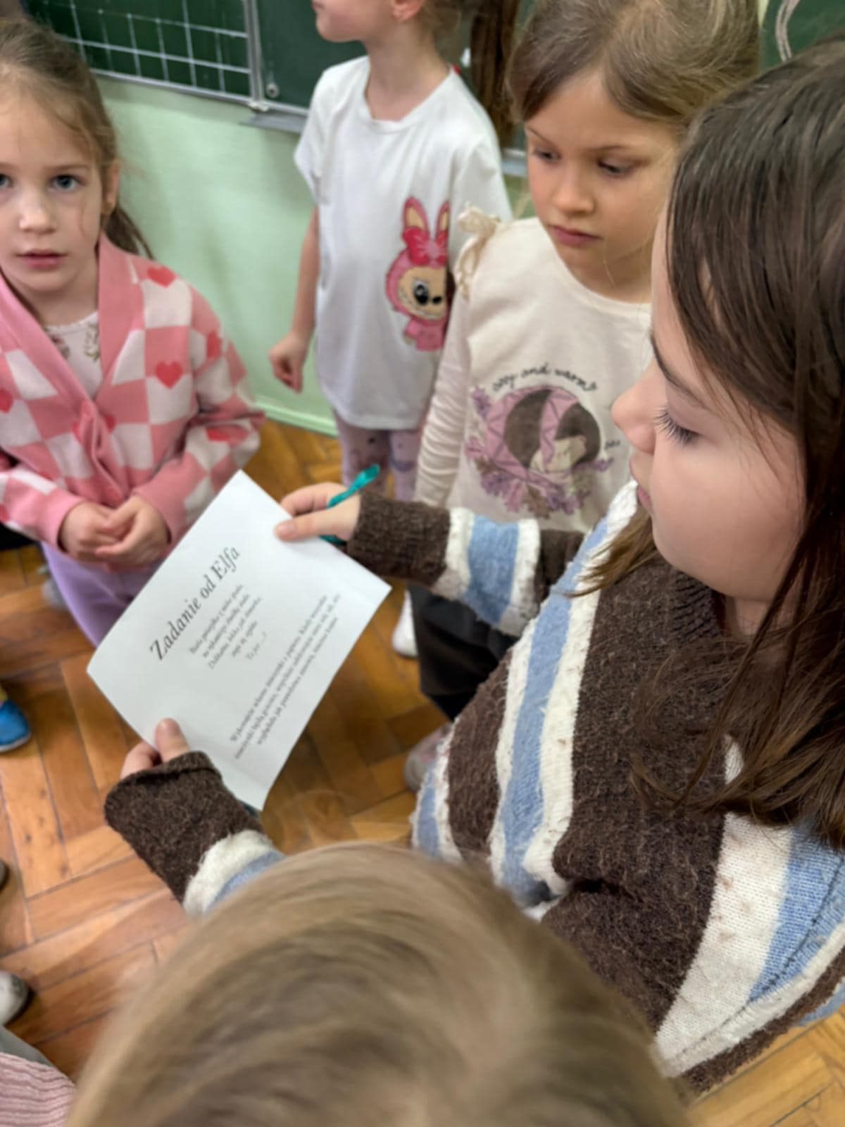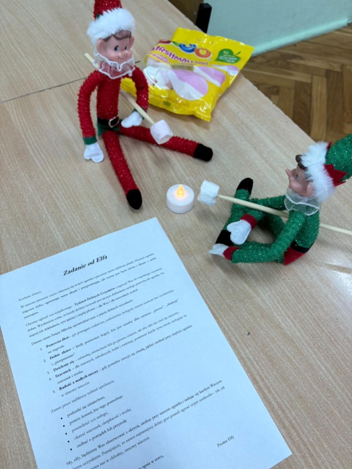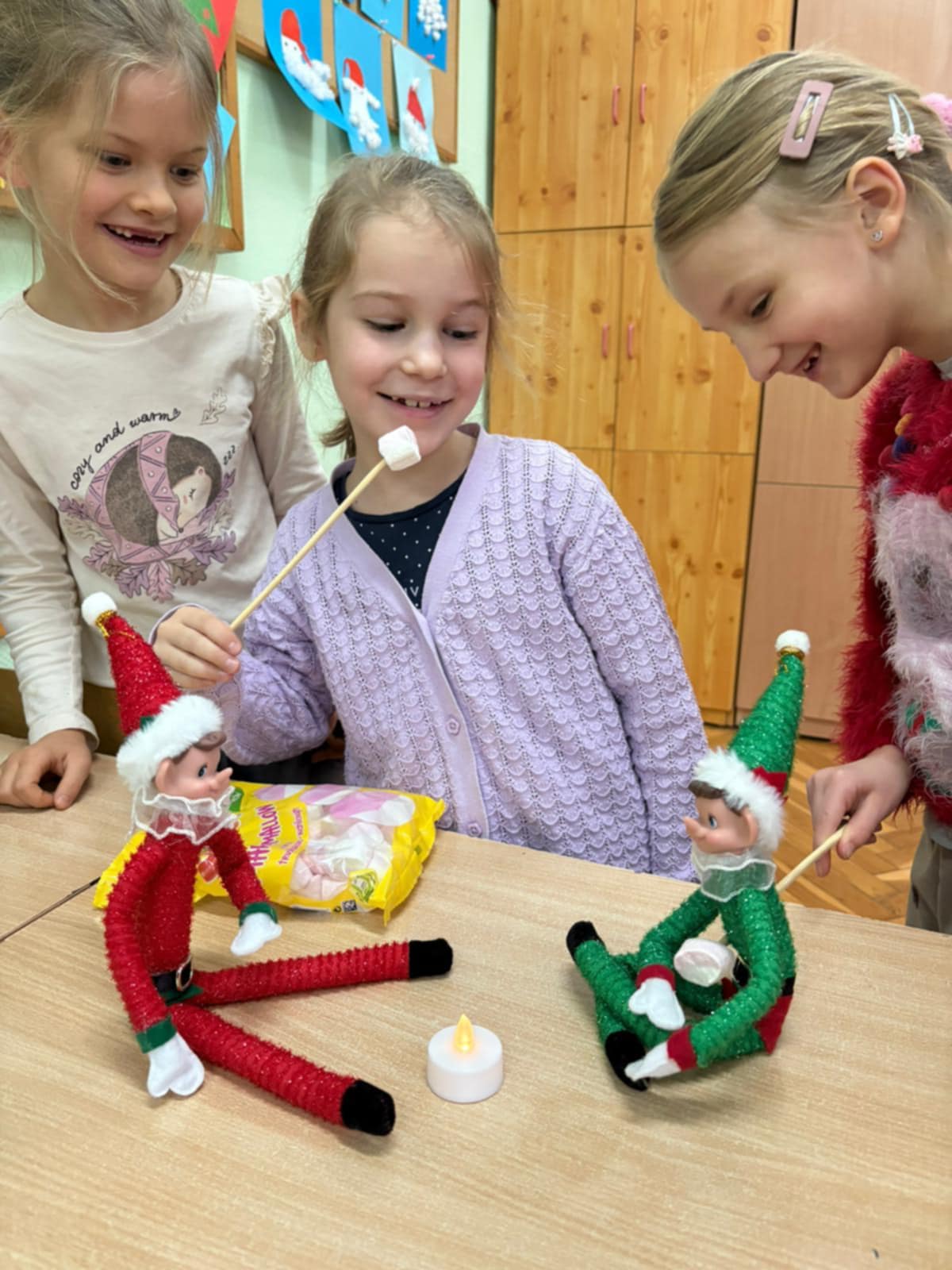 Grudzień w klasie 1B upłynął w wyjątkowo magicznej atmosferze, a wszystko za sprawą wizyty Psotnych Elfów, które spędziły w szkole aż 2 tygodnie. Codziennie czekały na uczniów nowe niespodzianki, wywołujące wiele radości i uśmiechów. Jeden z elfów słynął ze swoich zabawnych psot, które z humorem rozpoczynały każdy dzień w szkole. Drugi elf zostawiał dzieciom kreatywne zadania do wykonania, zachęcające do współpracy, rozwijania wyobraźni oraz twórczego myślenia. Wizyta elfów sprawiła, że grudniowy czas nauki stał się jeszcze bardziej radosny i pełen świątecznej magii.