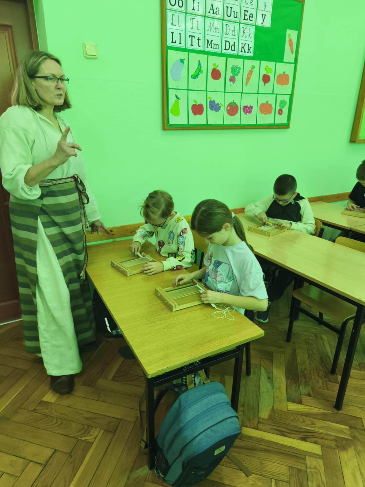 Na początek odbyła się ciekawa prezentacja przedstawiająca historię odzieży, naturalne surowce do produkcji tkanin oraz narzędzia i czynności towarzyszące produkcji tkanin. Wszystko mogliśmy dokładnie zobaczyć i poznać.