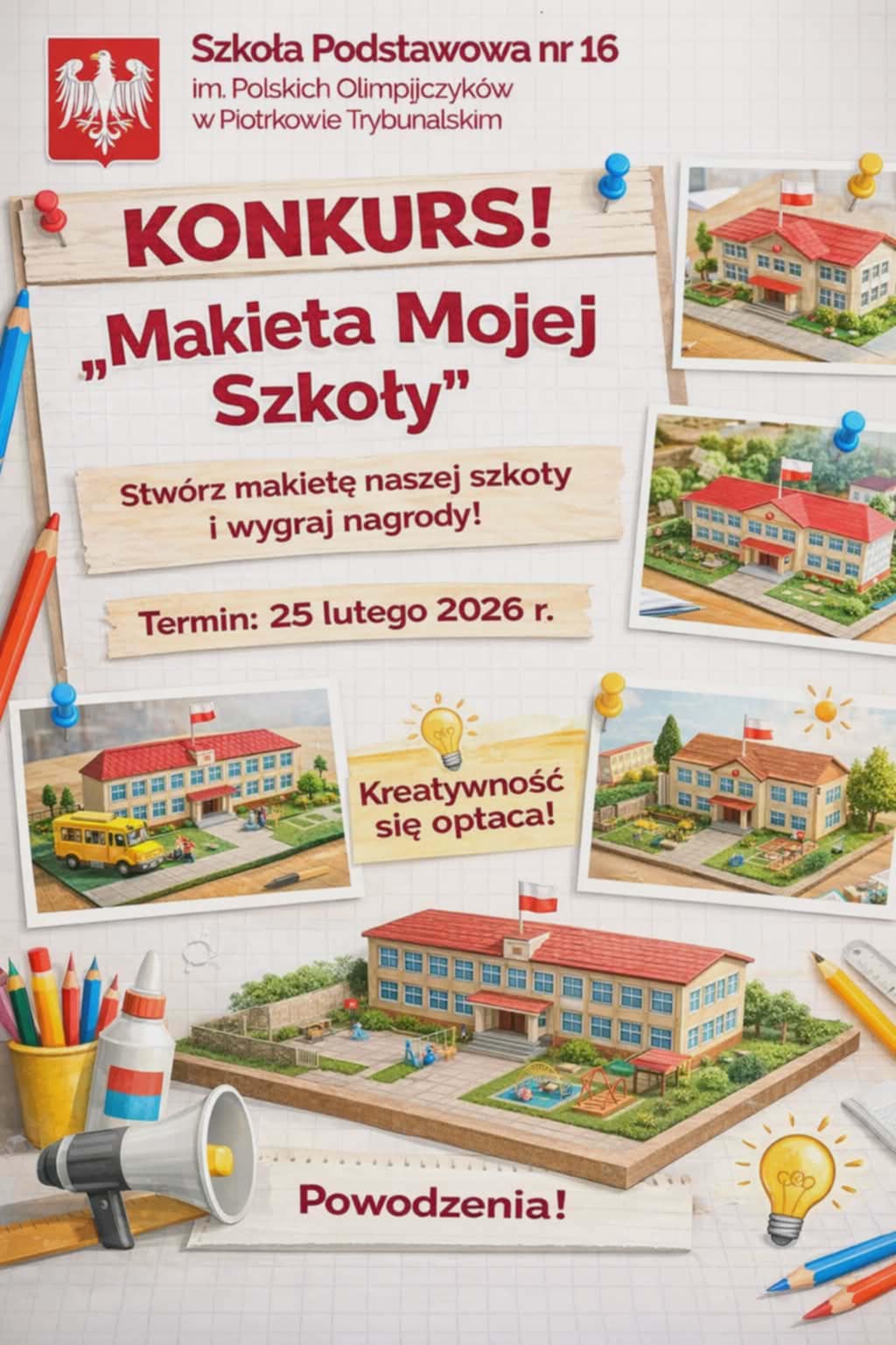 Konkurs polega na wykonaniu techniką dowolną pracy przestrzennej w postaci makiety szkoły.