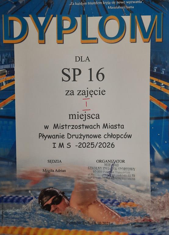 A w pływaniu drużynowym chłopców IMS zaprezentowali się: I. Cisowski, F. Mitera, J. Niemczyk, R. Pawlikowski, D. Woynowski, N. Zakrzewski uzyskując I miejsce.